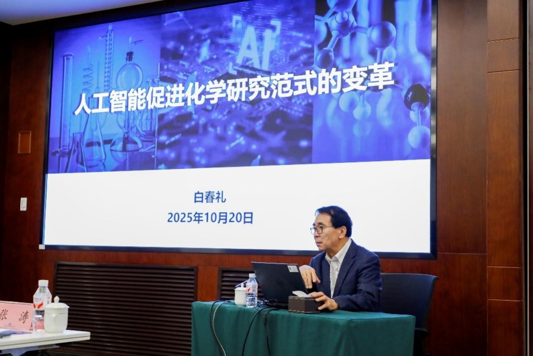 报告中,白春礼系统回顾了人工智能从概念萌芽到技术应用的历史发展脉络,详细阐述了人工智能在引发下一轮科技革命中潜在的引领性战略性主导作用,深入剖析了人工智能技术在加速化学反应预测与新物质发现、推动化学实验自动化与智能化、促进化学与其他学科交叉融合和深化化学文献与数据挖掘等方向促进化学研究范式的变革,同时也总结了人工智能应用于化学领域的关键挑战,并对未来发展路径进行展望。报告结束后,白春礼与我所科研人员围绕人工智能发展过程中的数据安全、法律法规、政策制度及科研人员未来方向选择等相关问题进行了深入的讨论和交流。