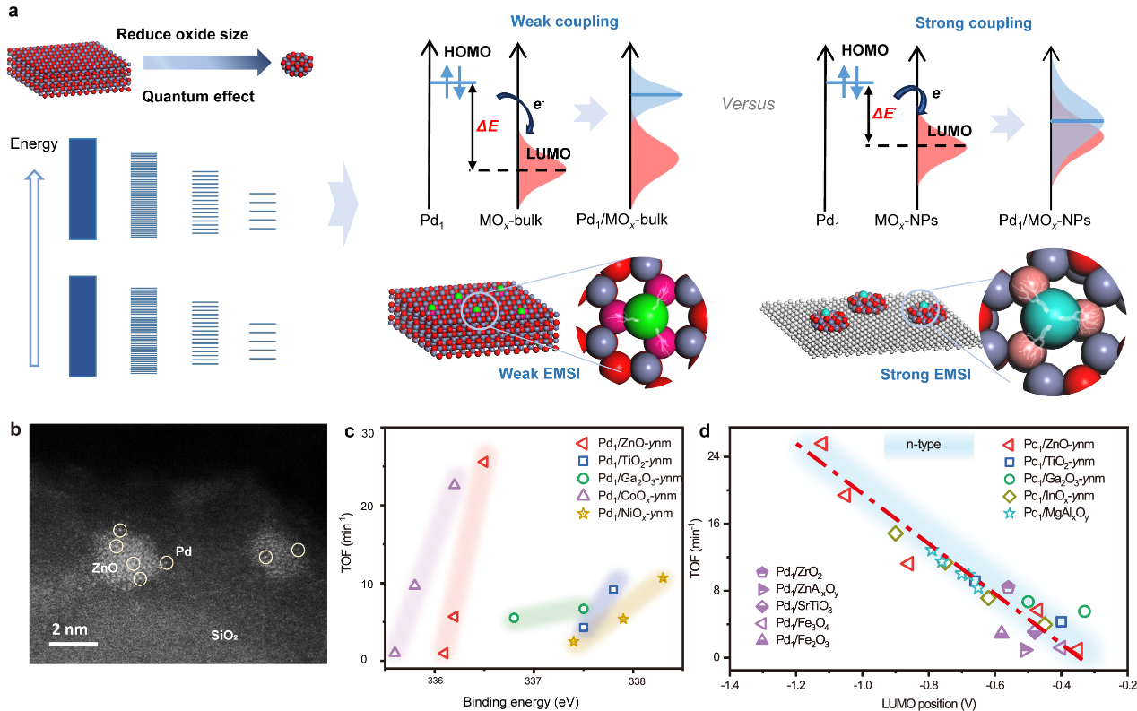 本工作在此基础上,创新性地将前线分子轨道理论(FMO)引入到单原子催化剂设计中,并借助原位显微-光电子能谱耦合技术,实现了一系列半导体氧化物负载的Pd1/MOx(M=Zn、Ti、Ga、Co、Ni等)单原子催化剂本征结构、本征电子态、本征能级的实验测量,揭示了单原子-载体轨道能级耦合与反应活性的定量关系。科研人员利用量子尺寸效应,通过改变MOx氧化物载体尺寸,实现了Pd单原子电子性质、乙炔选择加氢反应性能的精准调控。构-效关系的定量解析表明,在同类型氧化物载体上,Pd单原子的价态跟活性(TOF)呈现出良好的对应关系,但是在不同氧化物载体上并不能获得普遍性规律。相比之下,借助准原位紫外光电子能谱,科研人员实现了不同氧化物载体LUMO轨道能级的精准测量,并与反应活性关联,在34种Pd1/MOx催化剂(包含14种n型/p型半导体氧化物载体)上获得统一的线性关系。分子轨道理论计算进一步表明,氧化物载体LUMO轨道能级的上升,增强了Pd原子与载体的轨道杂化,显著提升单原子稳定性的同时,也进一步强化了杂化后Pd单原子活性中心与反应分子的轨道耦合,提升反应活性。此外,科研人员通过构-效关系进行筛选发现,Pd1/ZnO-1.9nm具有最佳乙炔加氢反应性能,在活性、选择性、稳定性上都显著优于现有Pd基催化剂。本工作实现了单原子催化剂本征能级的定量解析,首次提出载体LUMO轨道能级作为通用性描述符,实现单原子催化剂的高通量筛选,为从分子轨道理论诠释单原子催化本质提供了实验验证。